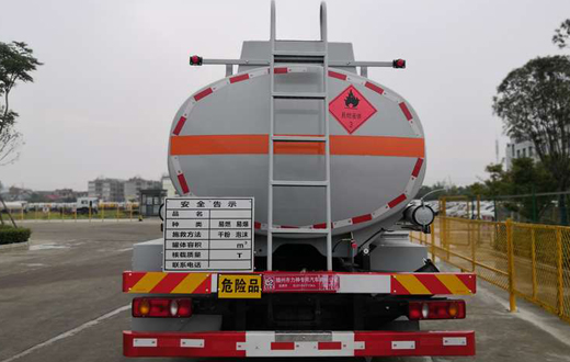 罐體有效容積:12.6立方米,危險貨物運輸車輛的類型為FL型,介質:柴油,煤油,汽油;類項號:3;罐體尺寸(長×長軸×短軸)(mm)為:5650×2050×1400;軸距與后懸對應關系分別為:4700/2370,5000/2070;側、后防護裝置材料材質:Q235B,側、后防護均采用螺栓連接,后防護裝置斷面尺寸為(mm):80×150,后部防護離地高度:500mm;隨底盤選裝駕駛室,選裝箱門樣式;安裝具有衛星定位功能的行駛記錄儀,排氣管前置,安裝前輪盤式制動器和限速裝置,限速80km/h,僅采用底盤子午線輪胎;ABS型號/生產廠家:3631010-C2000/東科克諾爾商用車制動系統(十堰)有限公司;發動機型號及油耗值(L/100km)為:B6.2NS6B210(26.5),DDi50E190-60(23.9).
