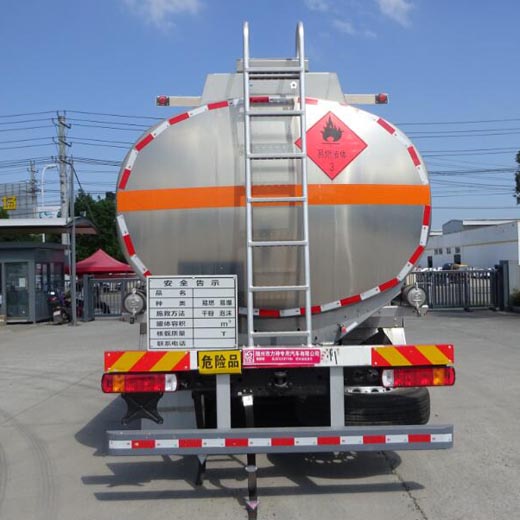 罐體總容量:25.9立方米,罐體有效容積:24.67立方米,危險貨物運輸車輛的類型為FL型,介質zui大密度830千克/立方米;罐體尺寸(長×長軸×短軸)(mm):8750×2300×1650;側、后防護裝置材料材質:Q235B, 側、后防護均采用螺栓連接,后防護裝置斷面尺寸為(mm):80×150,后部防護離地高度:420mm;隨底盤選裝駕駛室,選裝罐體兩側管廂樣式及出口箱樣式,選裝罐體尾部帶落水管和后示廓燈支架;安裝具有衛星定位功能的行駛記錄儀,安裝前輪pan式制動器和限速裝置,限速80km/h,僅采用底盤子午線輪胎;安裝EBS,EBS型號/生產企業:0 486 106 XXX/克諾爾商用車系統企業管理(上海)有限公司;發動機型號及油耗值(L/100km)為:X11NS6B360(33.6),該車后軸采用空氣懸架;轉向輪安裝bao胎應急防護裝置.該車型可選裝ETC車載裝置;