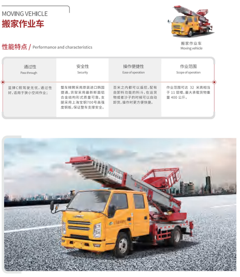 高空作業(yè)車價(jià)格_高空作業(yè)車廠家_楚勝集團(tuán)★13908669111★江鈴30米搬家作業(yè)車產(chǎn)品名稱:楚勝牌CSC5041TBA6J30型搬家作業(yè)車,采用江鈴JX1041TSG26底盤改裝而成,該車專用裝置為云梯梯臂,主要用于搬家作業(yè)。作業(yè)范圍可達(dá)32米高相當(dāng)于11層樓,最大承載貨物重量400公斤。本公司專業(yè)生產(chǎn)銷售各類伸縮臂高空作業(yè)車,折疊臂高空作業(yè)車,液壓升降車,搬家云梯車,外形美觀,操作方便,節(jié)省燃油。更多高空作業(yè)車盡在:m.siski.cn