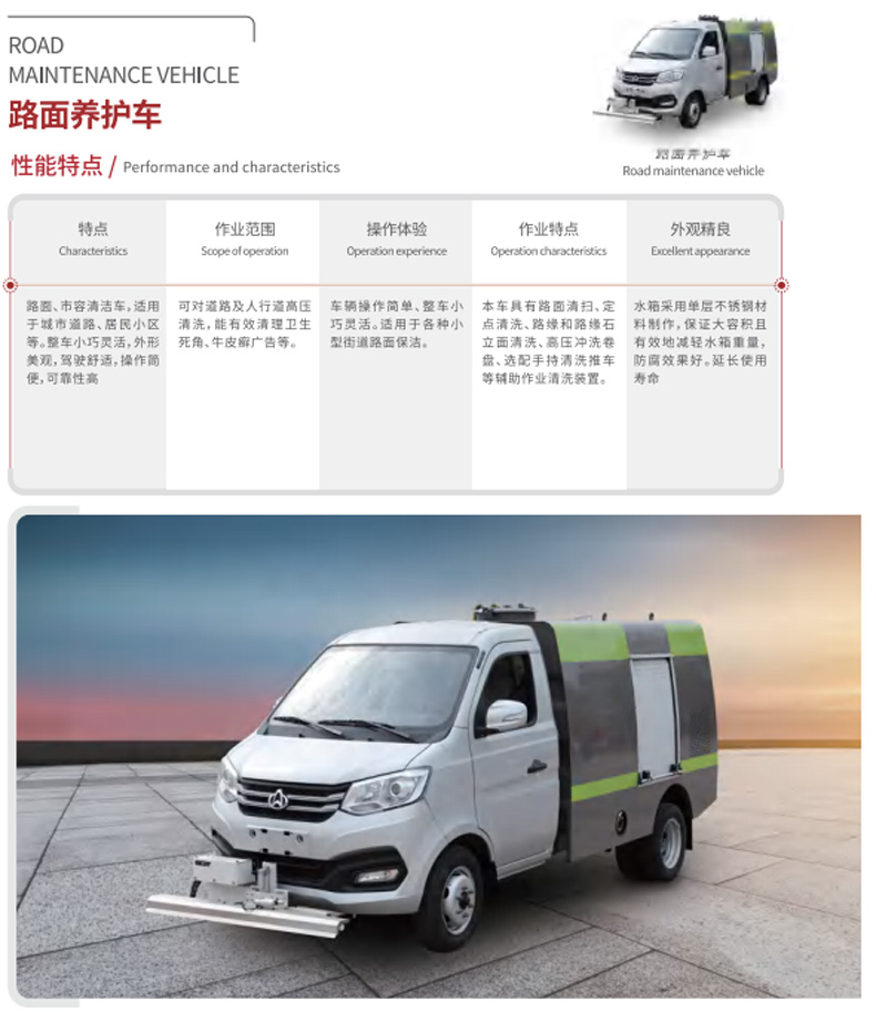 路面、市容清潔車,適用于城市道路、居民小區等。整車小巧靈活,外形美觀,駕駛舒適,操作簡便,可靠性高