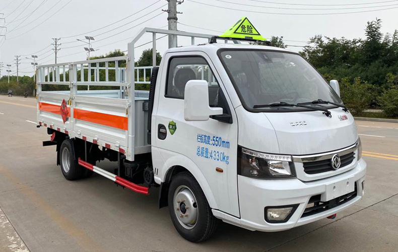 1、該車適用于運輸危險品。類項號:2.1,2.2。2、側,后防護材料均為Q235,焊接連接,截面尺寸100×50mm,下邊緣離地高380mm。選裝無柵欄,選裝貨箱箱板結構。外形尺寸長/軸距/后懸的對應關系(mm):5900/3200/1510,5500/3200/1110,5500/2800/1510,5200/2600/1410,4900/2600/1110。3、選裝后視鏡。僅選用排氣管前置、限速裝置(限速80km/h)、前輪盤式制動及子午線輪胎的底盤,轉向輪安裝輪胎爆胎應急防護裝置,安裝帶有衛星定位功能的行駛記錄儀。選裝ETC。ABS系統型號/生產廠家:ABS/ASR-12V-4S/4M/襄陽東風隆誠機械有限責任公司。5、采用的發動機與油耗值(L/100Km)對應關系為:Q23-95E60/11.6。整備質量包括備胎、滅火器、隨車工具、停車楔。欄板重量:370kg,320kg。材質/厚度:底板,碳鋼/3mm;欄板,碳鋼/2mm。
