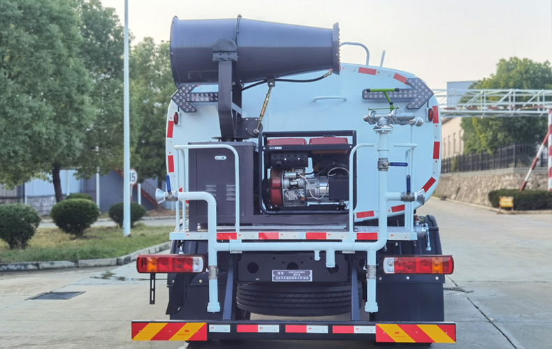 消防灑水車安裝消防車專用消防泵、消防炮、消防取力器。罐體后帶工作平臺,平臺上安裝綠化灑水炮,灑水炮可全方位旋轉,帶前沖后灑,帶側噴,可連續調成直流狀、霧狀、大雨、小雨、毛毛雨,帶安全護欄。罐體頂部安裝消防水炮。帶消防接口,可通過消防栓進水,帶自流閥,消防綠化卷盤。