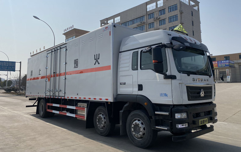 1、該車為危險品運輸車,廂體頂部封閉,不可開啟,危險貨物運輸車輛類型:EX/Ⅲ.該車用于運輸具有獨立容器(瓶)包裝的爆炸品。類項號:1.1B,1.1C,1.1D,1.1G,1.2C,1.2D,1.2G,1.3C,1.3G,1.4C,1.4D,1.4G。2、側防護及后防護材料為Q235,側防護螺栓連接,后防護焊接,截面尺寸120×50mm,下邊緣離地高355mm.3、整車長/軸距/后懸對應關系為(mm): 11995/1800+5600/3145,10995/1800+5000/2745,10095/1800+4200/2645.僅采用前輪盤式制動器,前置排氣管,子午線輪胎,限速裝置的底盤,限速80km/h;轉向輪安裝爆胎應急防護裝置;后軸采用空氣懸架;該車型可選裝ETC車載裝置.發動機/油耗值(L/100km)/凈功率(KW)對應關系為: MC07.25-60/28.52/185, MC07.27-60/28.52/199, MC07.31-60/28.52/225。該車安裝具有衛星定位功能的行駛記錄儀;EBS型號:EBS3;EBS系統生產企業: 采埃孚商用車系統(青島)有限公司.廂體側面選裝開門型式及位置,選裝不帶側開門,選裝后門合頁,選裝貨廂平面或瓦楞結構;廂體側面板選裝開百葉窗,選裝后部樣式;隨底盤選裝駕駛室,選裝后處理器樣式和安裝位置.隨底盤選裝車身拉花標識.