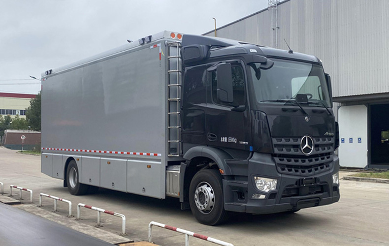 車頂封閉切不可開啟。該車主要用于戶外維修,主要專用裝置為工具柜,線纜盤,工具箱,絞盤,電焊機,空氣壓縮機。側后防護均采用裙邊結構,后防護下邊緣離地高度500mm。EBS系統型號/生產企業為:EBS4+/WABCO。