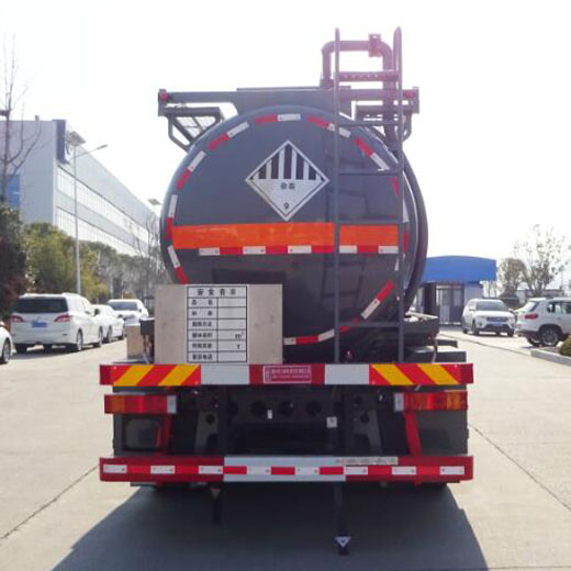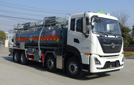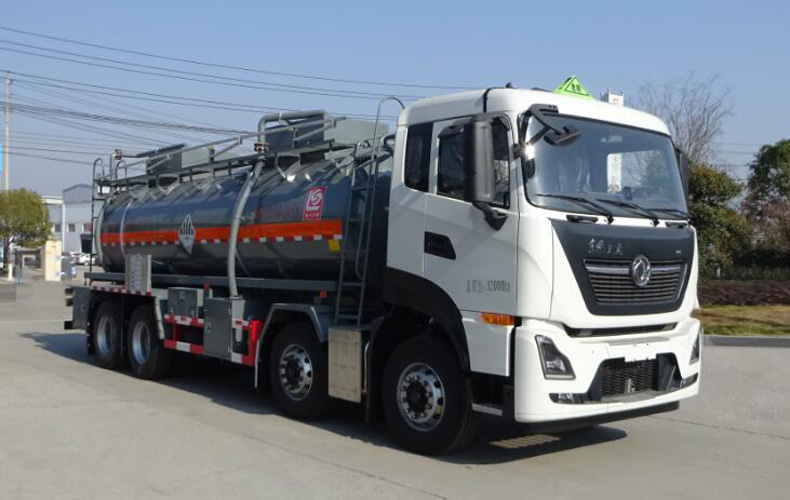 罐體總容量:18.2立方米,罐體有效容積:17.4立方米,危險貨物運輸車輛的類型為AT型,介質最大密度1050千克/立方米;罐體尺寸:長7800mm,直徑1800mm;僅采用1995+3800+1350mm軸距;側、后防護裝置材料材質:Q235B,側、后防護均采用螺栓連接,后防護裝置斷面尺寸為(mm):80×150,后部防護離地高度:445mm;隨底盤選裝駕駛室,選裝尾部出口箱樣式,選裝罐體前端無爬梯,右、后側無吸料管,選裝罐體兩側管廂樣式及出口箱樣式;安裝具有衛星定位功能的行駛記錄儀,排氣管前置,安裝前輪pan式制動器和限速裝置,限速80km/h,僅采用底盤子午線輪胎;安裝EBS,EBS型號/生產廠家:EBS5/東科克諾爾商用車制動系統(十堰)有限公司;僅適合發動機型號及油耗值(L/100km)為:DDi75E350-60(38.1),L9NS6B400(38.2).該車后軸為采用空氣懸架.轉向輪安裝bao胎應急防護裝置,該車型可選裝ETC車載裝置;