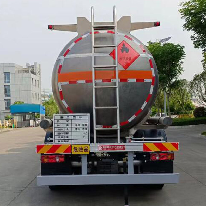 罐體總容量:21.5立方米,罐體有效容積:20.4立方米,危險貨物運輸車輛的類型為FL型,介質zui大密度830千克/立方米;罐體尺寸(長×直徑)(mm)為:7400×2000;僅采用1995+5000mm軸距;隨底盤選裝駕駛室及后處理器外觀,選裝側防護工具箱樣式,選裝尾部出口箱樣式,選裝管廂樣式,選裝罐頂保護裝置樣式,選裝后爬梯位置;側、后防護裝置材料材質:Q235B,側、后防護均采用螺栓連接,后防護裝置斷面尺寸為(mm):80×150,后部防護離地高度:480mm;安裝具有衛星定位功能的行駛記錄儀,排氣管前置,安裝前盤制動器和限速裝置,限速80km/h,僅采用底盤子午線輪胎;安裝EBS,EBS型號/廠家:EBS5/東科克諾爾商用車制動系統(十堰)有限公司;發動機與油耗申報值(L/100km)對應關系為B6.2NS6B260(33.44),YCS06245-60A(31.32);該車后軸采用空氣懸架;轉向輪安裝bao胎應急防護裝置;選裝直接供電式ETC車載裝置.